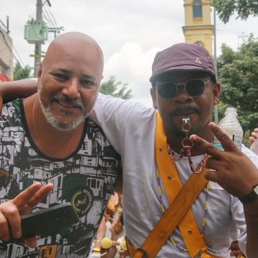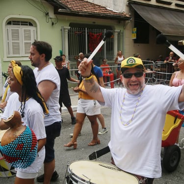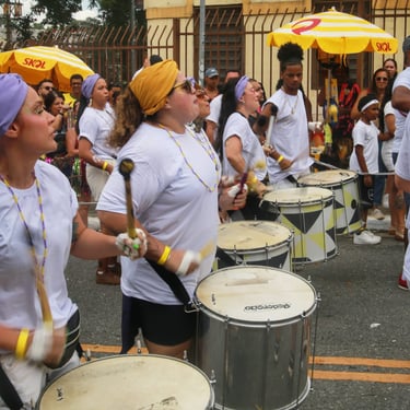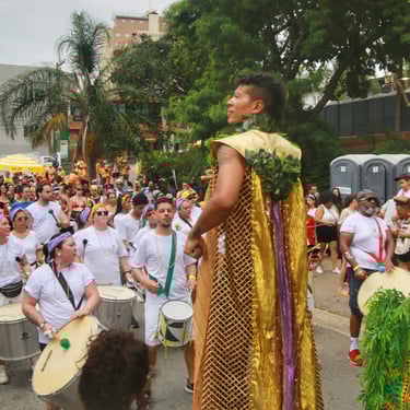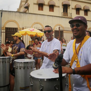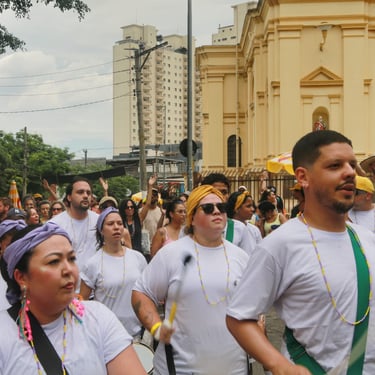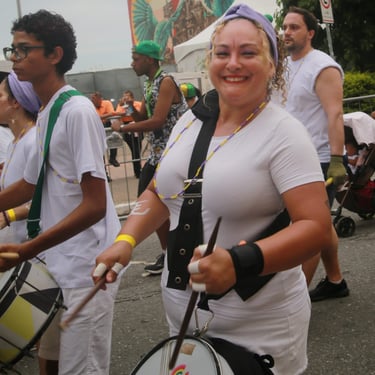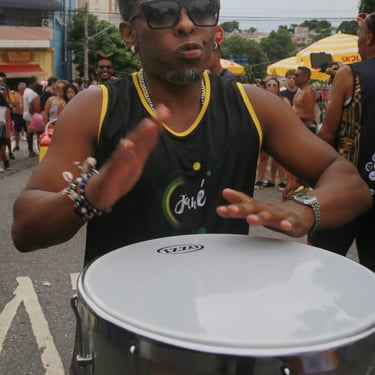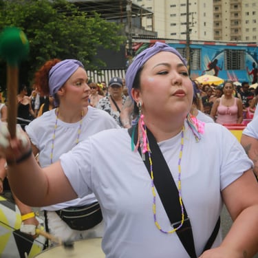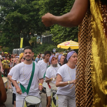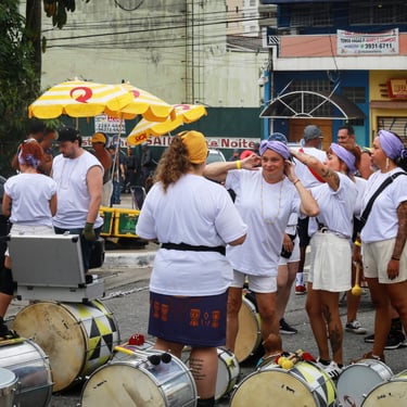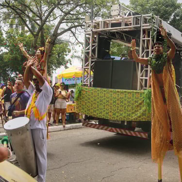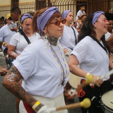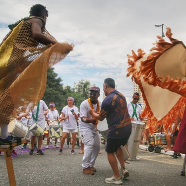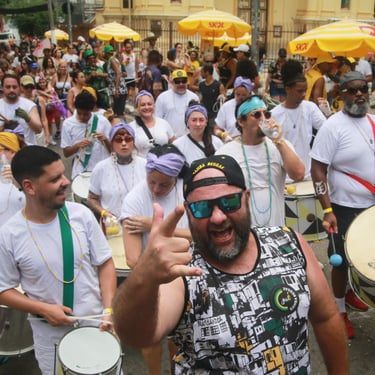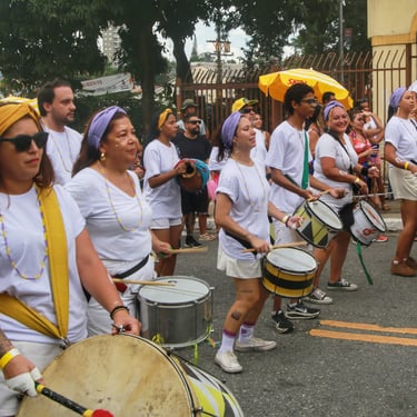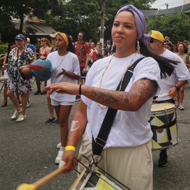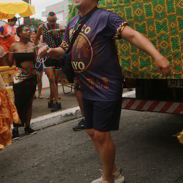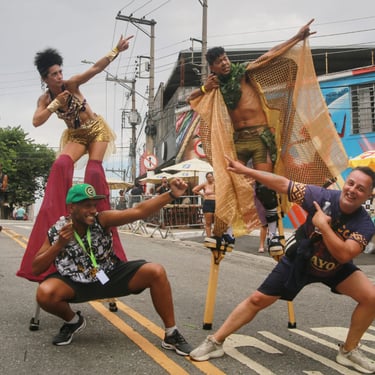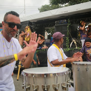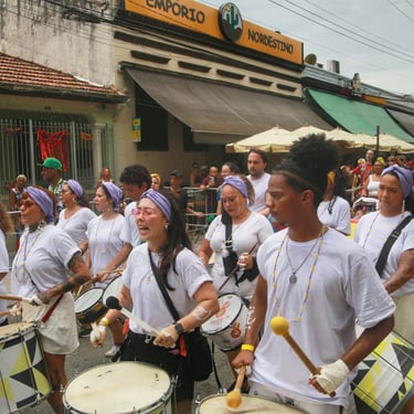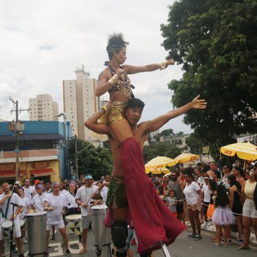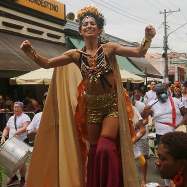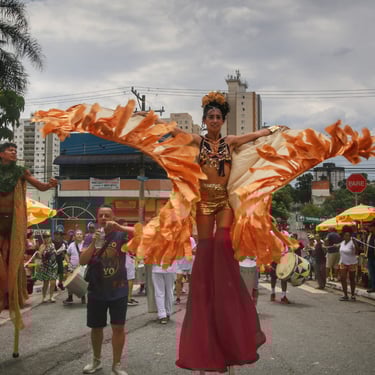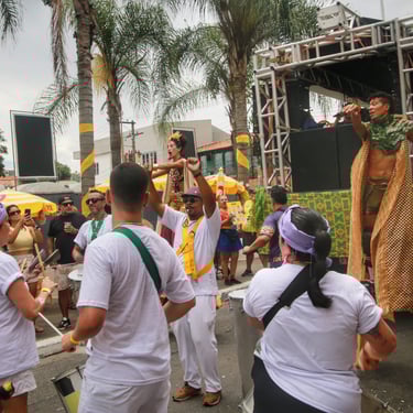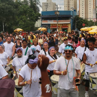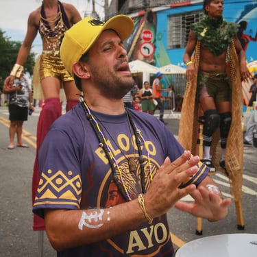Fotos da apresentação do Bloco AYO no carnaval 2026 no bairro Freguesia do Ó, em São Paulo.